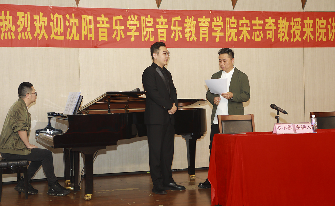 宋志奇教授以“歌唱中咬字与吐字的运用”为主题,结合自身丰富的教学与演唱经历,深入浅出地阐述了咬字吐字在声乐演唱中的关键作用。他还分享了许多实用的声乐技巧,从气息的运用、共鸣的调节到情感的表达,他都给出了专业且独到的见解。他鼓励大家要深入理解作品的创作背景和文化内涵,只有这样才能更好地诠释作品,打动听众。讲座现场,四位同学依次登台进行了演唱表演。同学们歌声悠扬,展现出扎实的功底。针对同学们的演唱,宋志奇教授进行了细致入微的现场指导。
