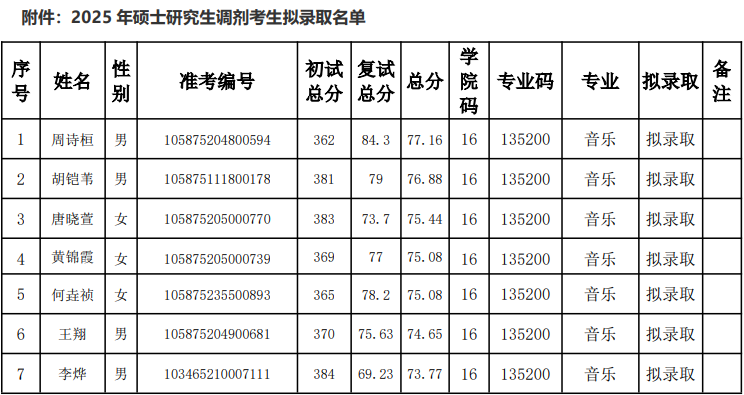 根据学校及小说狂人 研究生招生工作的相关文件精神和要求,经学院研究生招生录取工作领导小组审定,将小说狂人 2025年硕士研究生调剂考生拟录取名单予以公示。 公示时间为2025年4月15日至4月21日,共7日。考生如对拟录取结果有异议,请在公示期内以书面形式实名向学院研究生招生办公室反馈。若有拟录取后放弃的考生或招生计划增加,按总分排名依次候补录取。