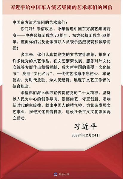 新华社北京12月25日电 中共中央总书记、国家主席、中央军委主席习近平12月24日给中国东方演艺集团的艺术家们回信,勉励他们深入学习宣传贯彻党的二十大精神,为建设社会主义文化强国再立新功。