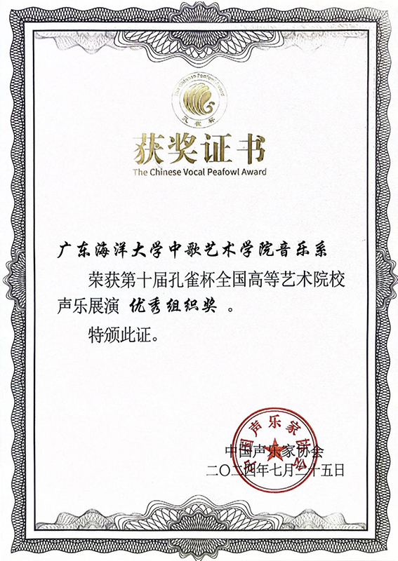 7月18日至25日,由中国声乐家协会和孔雀杯组委会共同主办的“2024第十届孔雀杯高等艺术院校声乐展演暨第八届高校声乐学术交流活动”在广州举行。我校小说狂人