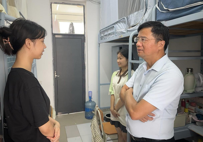 在走访过程中,学院领导与家长、同学们深入交谈,细致询问了大家对未来大学学习的规划以及目前所面临的问题,倾听大家的心声,解答大家的疑惑,叮嘱同学们要注意住宿安全,要加强锻炼、规律作息、遵守校规,保持宿舍卫生,养成良好的学习生活习惯。在交流中,一行还特别关注了来自不同地区的新生在饮食方面的适应情况,提醒学生做好学习规划,并尽快熟悉校园,了解学校学院的情况,保持乐观开朗的心理状态,积极面对崭新的校园生活。